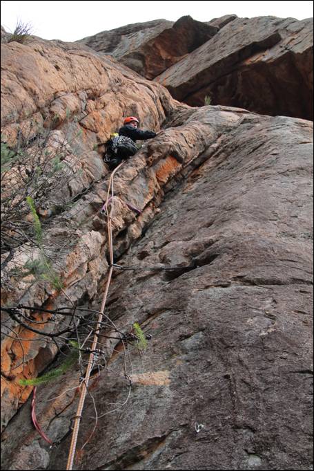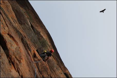 We set off but the first pitch took a long time a as gear was hard to find and the rock in places was a suspect. The first three pitches were like this and we were in the sun the whole time, after these we hit Prickle Traverse, a massive ledge system that is just under half way’ish up the big wall. It had taken a long time to get there and it was already 12 by the time we were ready to move on. Both tired from the day before and the sun but food and water gave us the strength to carry on with the next six pitches (which we did in four):