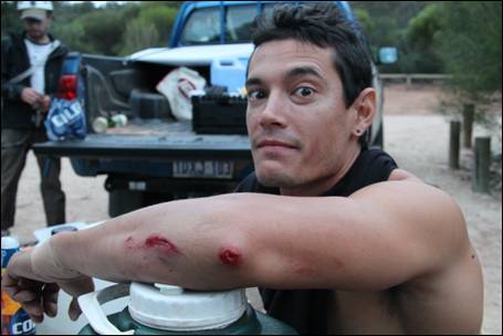 When Chris and Ryan got back we heard how Chris had attempted a very tenuous looking seam with marginal RP protection, and had fallen from about 5m ripping all the gear and hitting the deck flat on his back. He was luck to land on the rope but did sprain a wrist, bruise his back and cut his elbow so Steve set up surgery and patched him up: