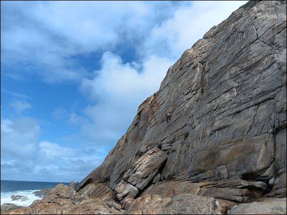 Steep inclines dip down to a mostly rocky shoreline that comprises bays in which beaches have formed. Erosion over time has resulted in scattered cliffs of various sizes, as opposed to a continuous rocky defence against the ocean. While this was all new to us, Kym had been provided some intel from Lord Jim. A long, long, long time explorer and climber of the amazing places the great southern region has on offer. As such we did have a notion of where to head and how to get there. That said we took our time and were careful: