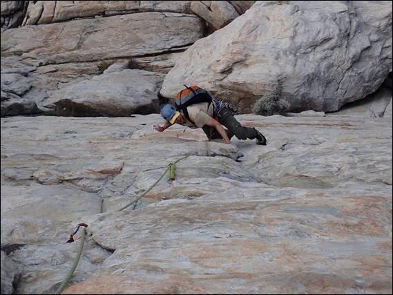 To be more precise it is more the uncertainty of knowing where the next gear will be. With the routes we picked he certainly showed he was happy to run it out, when he knew where the placements were. At times running it out in excess of six meters. However, once he had to move past that point, and where the route was hard to read, his head would start to play games and hold him back. Endeavoured to explain what to expect as he got higher, the height worked against us as it started to make communications that bit more tricky: