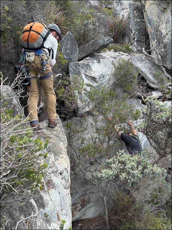 To avoid having to scramble down after each climb we set up a rap line, avoiding having to disturb any vegetation with multiple descents. Howsie was next up and had already spied his line. Again trusting his instincts and sticking with something that looked a sensible first sample of the rock on lead. It was again a nice clean line, the rock and the cliff was proving to be a bit of a gem in that regard. He lead a longer 45m route, that was nicely consistent and had some very pleasant sequences and moves and plenty of gear to make it safe: