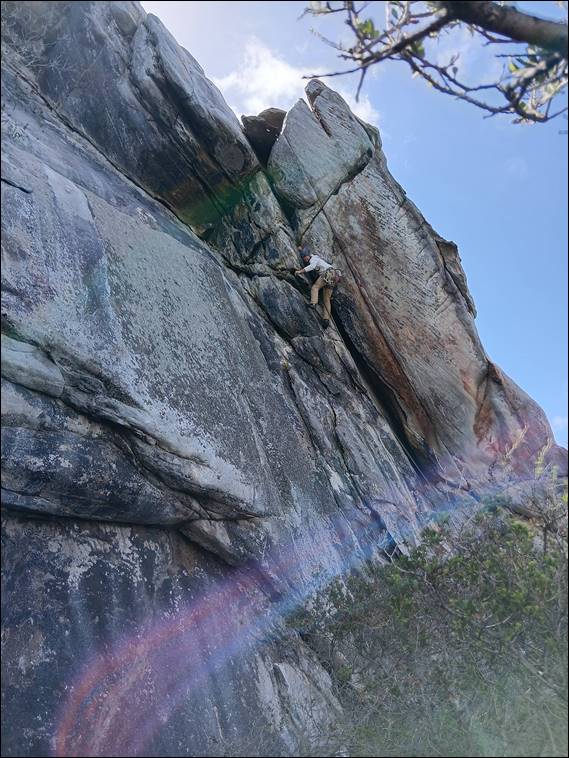 So became Army Surplus (14 40m), VS 4c in UK grades. Hats off to Kym for sticking at it and keeping his nerve. After enjoying hr lofty views we found a way down that included a couple of fun scrambles, and as with all adventure routes the down climb is part of the experience and makes it twice as fun. Back at the base the big question was what next. It all looked quite improbable. I had however spotted what I felt might be a fun route. But it did start in the same corner as Kym’s line: