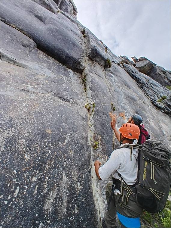 Howsie named that line Victorinox (18 20m), E1 5a in UK grades. A line that would be worth coming back for, but as for the other stuff on this upper wall it was hard to see much else. Two images up, Howsie and I were mentally climbing the crack system in front of us. Hands moving about in the air to show how we could tackle it, despite the fact that the system was closed and didn’t off any gear placements. The image does however show just how smooth the rock was on the lower part of this cliff, more akin to what I would expect quartzite to be: