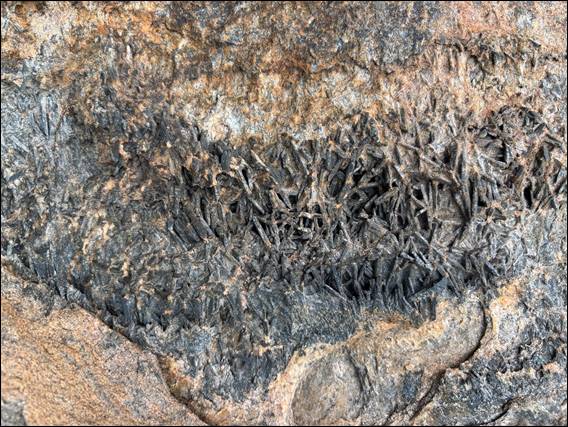 So became Iron Age (6 15m), which is classed M in UK grades and is the lowest UK climbing grade that can be assigned. However, as you may realise I don’t care about the numbers, it was a very fun climbing made all the more interesting by the rock we climbed on. Unlike yesterday’s cliffs and the upper walls today this little outcrop had bands of amazing crystals. I’ve unsuccessfully tried to find out what they may be called, but can say they have an iron component hence the route names. Each exposed needle being very sharp and strong: