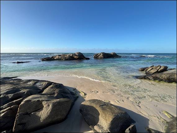Encouraged by yesterday’s ocean conditions, which had finally settled down to what we would normally expect it be like, I decided to walk past the point to the more intact reefs. I could have driven. A sand bar had formed across the Capel River mouth. as usually happens during the low rainfall period of the year. What with my sedentary job, I didn’t mind walking down and it was only a couple of kilometres. Beside if I drove I’ve have to let the tyres down and then pump them back up, and that becomes a phaff that I just can’t be bothered with: